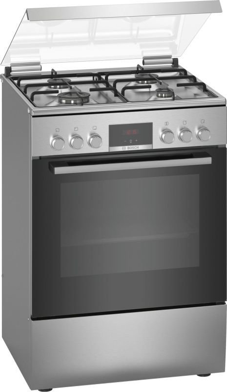 : BoschKombinovaný sporák Bosch HXN39AD50 v nerezovom prevedení je zaradený v energetickej triede A. Varná doska má 4 plynové horáky: 1 úsporný, 1 silný a 2 normálne. Každý horák disponuje termoelektrickou poistkou. Smaltované mriežky majú gumové nožičky. Praktický a štýlový je aj sklenený poklop. Ovládanie je veľmi jednoduché a intuitívne prostredníctvom 6 otočných gombíkov s integrovaným elektrickým zapaľovaním a LED displeja. Elektrická rúra ponúka 7 druhov ohrevu v rozmedzí teplôt 50 °C - 275 °C. Vnútorný objem rúry tvorí 66 l. Je vybavená závesnými roštami. Čistenie rúry prebieha pomocou EcoClean Direct na zadnej stene. Dodávané príslušenstvo: kombinovaný rošt, univerzálna panvica. Šírka: 60 cm.