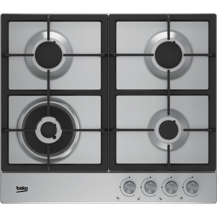 : BekoPlynová varná doska, nerezový povrch, šírka 60 cm, 4 plynové horáky, predné ovládanie, bezpečnostná poistka plameňa, strieborné ovládacie gombíky