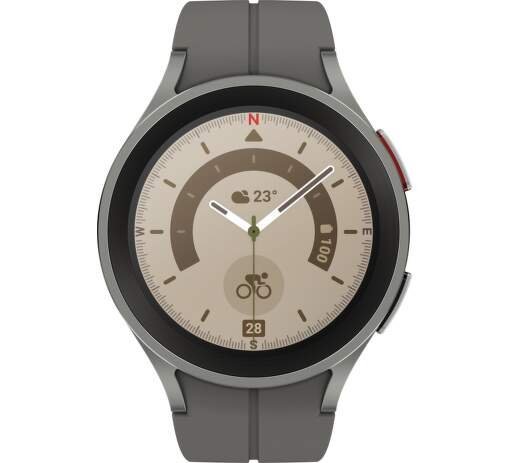 : SamsungSmart hodinky Samsung Galaxy Watch5 Pro 45 mm v čiernej farbe s telom z titánu a dotykovým AMOLED displejom ponúkajú Bluetooth, NFC, 16 GB úložisko, výdrž batérie až 3 dni a systém Wear OS.